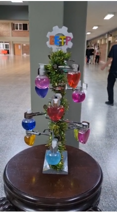Los estudiantes Lucía del Castillo, Ingrid Perrig y Franchesco Enrico de 5° “B” T.Q. sorprendieron a la comunidad educativa con la creación de un árbol de Navidad construido a partir de elementos simbólicos de las Tecnicaturas en Química y en Equipo e Instalaciones Electromecánicas. Los alumnos mencionados combinaron elementos y materiales propios de cada área para diseñar una pieza creativa que refleja el espíritu técnico de la institución.